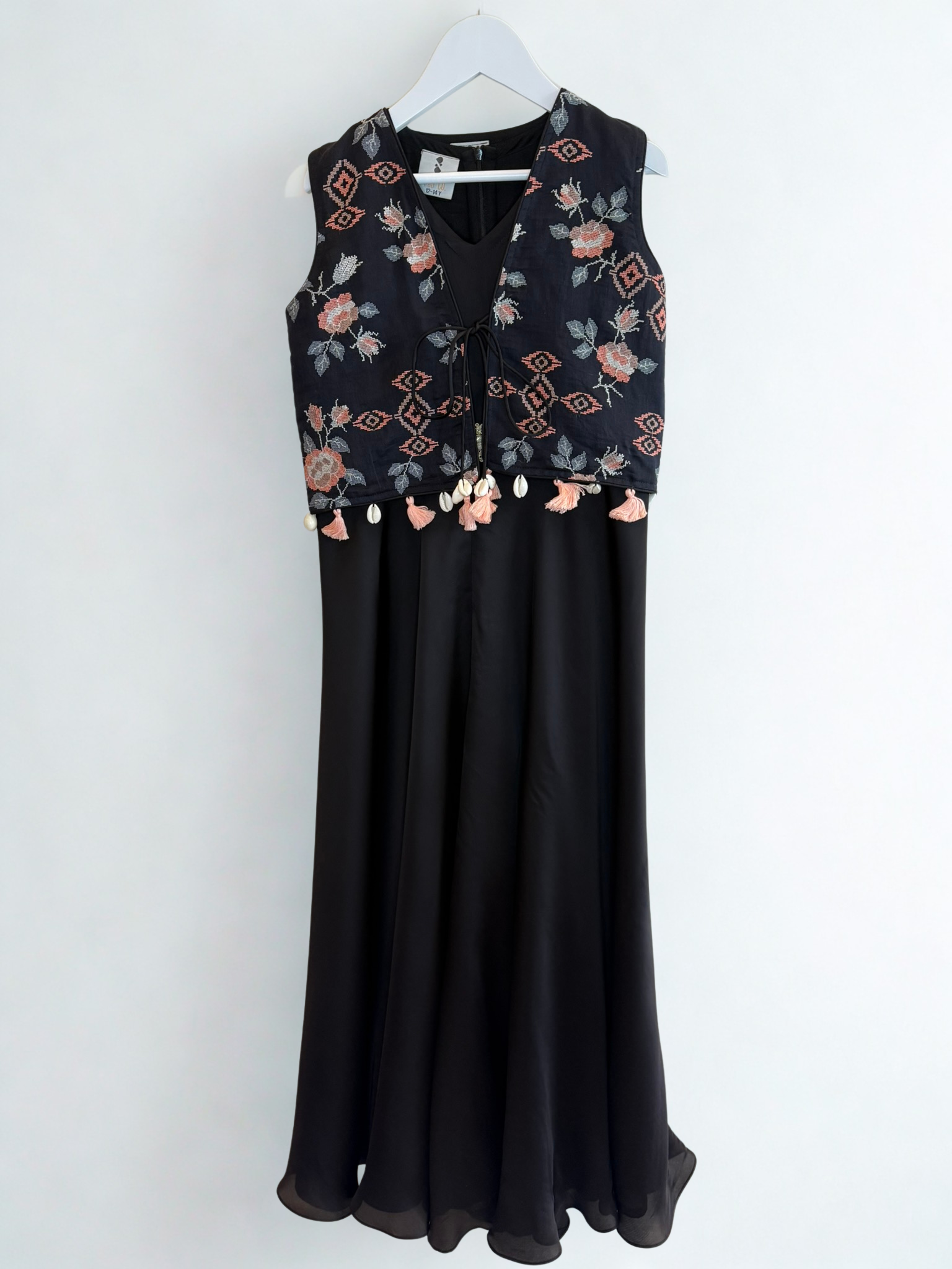 Black Jumpsuit with Cross-stitch Embroidered Waistcoat