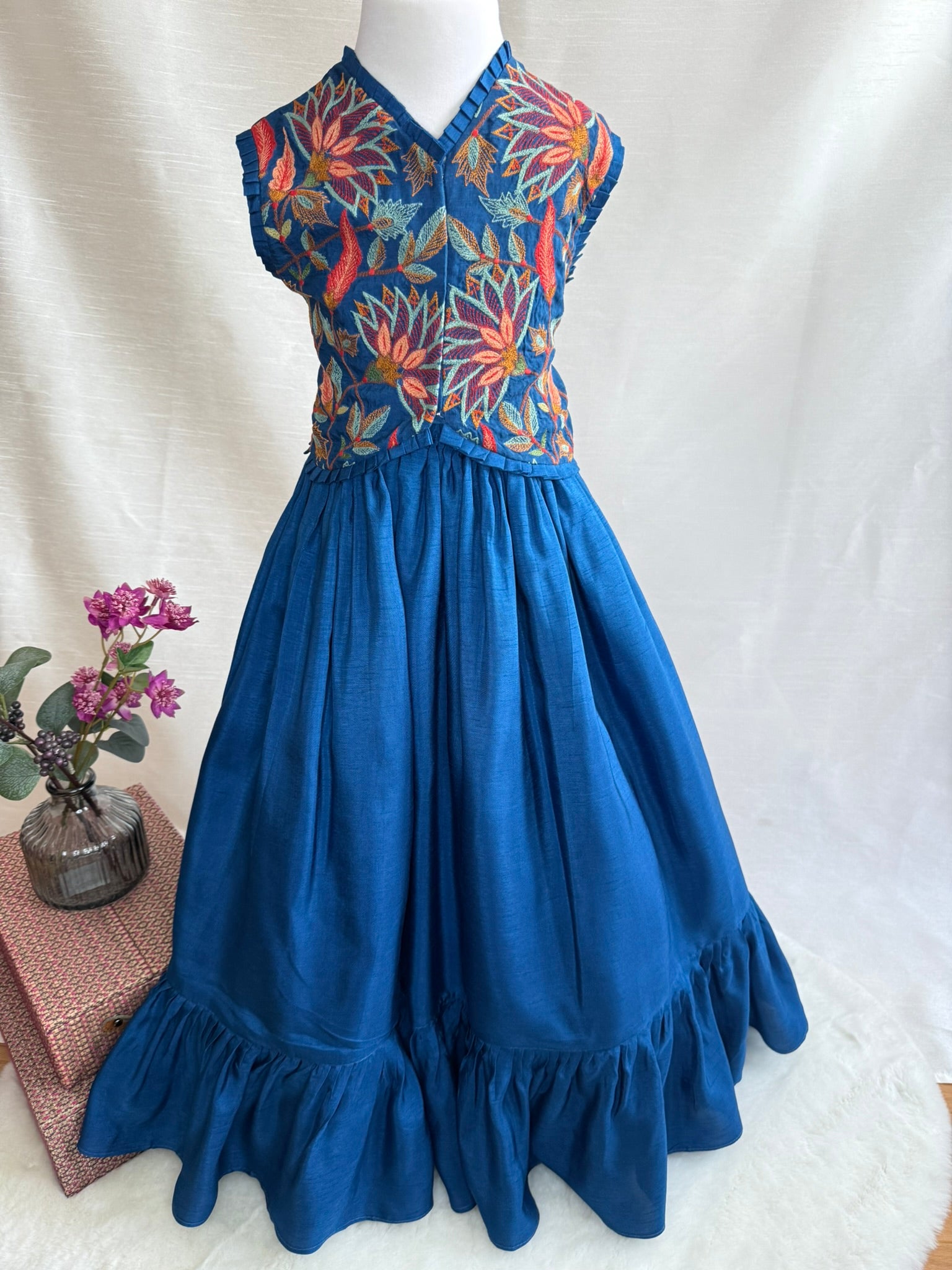 Let your girl twirl into the limelight wearing this beautiful blue lengha! This royal blue stunner features a blouse completely covered in colourful thread work embroidery, with a cute motif at the back too. The pleated detailing around the neckline, armholes and hemline along with the pleated tier at the bottom of the skirt gives it a unique look. The elasticated waistband provides complete freedom to dance and play while staying comfy at every fabulous celebration!