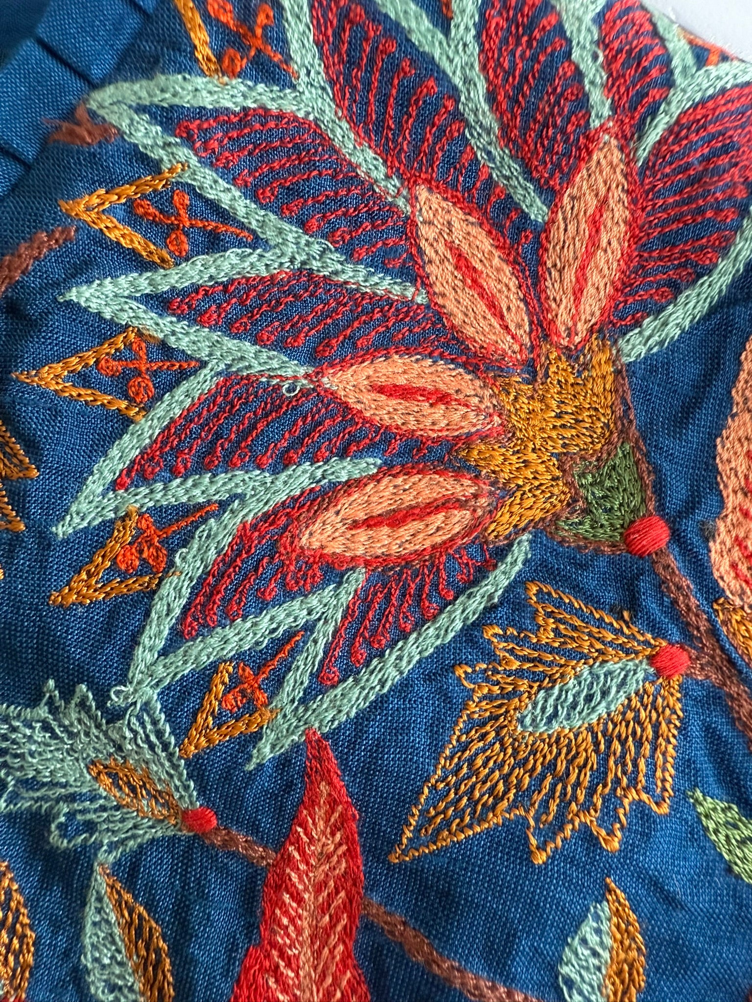 Lining: Mul mul cotton, which is a lightweight, soft and breathable fabric known for its delicate, gauzy texture. It is often loosely woven, giving it a slightly sheer and airy quality.