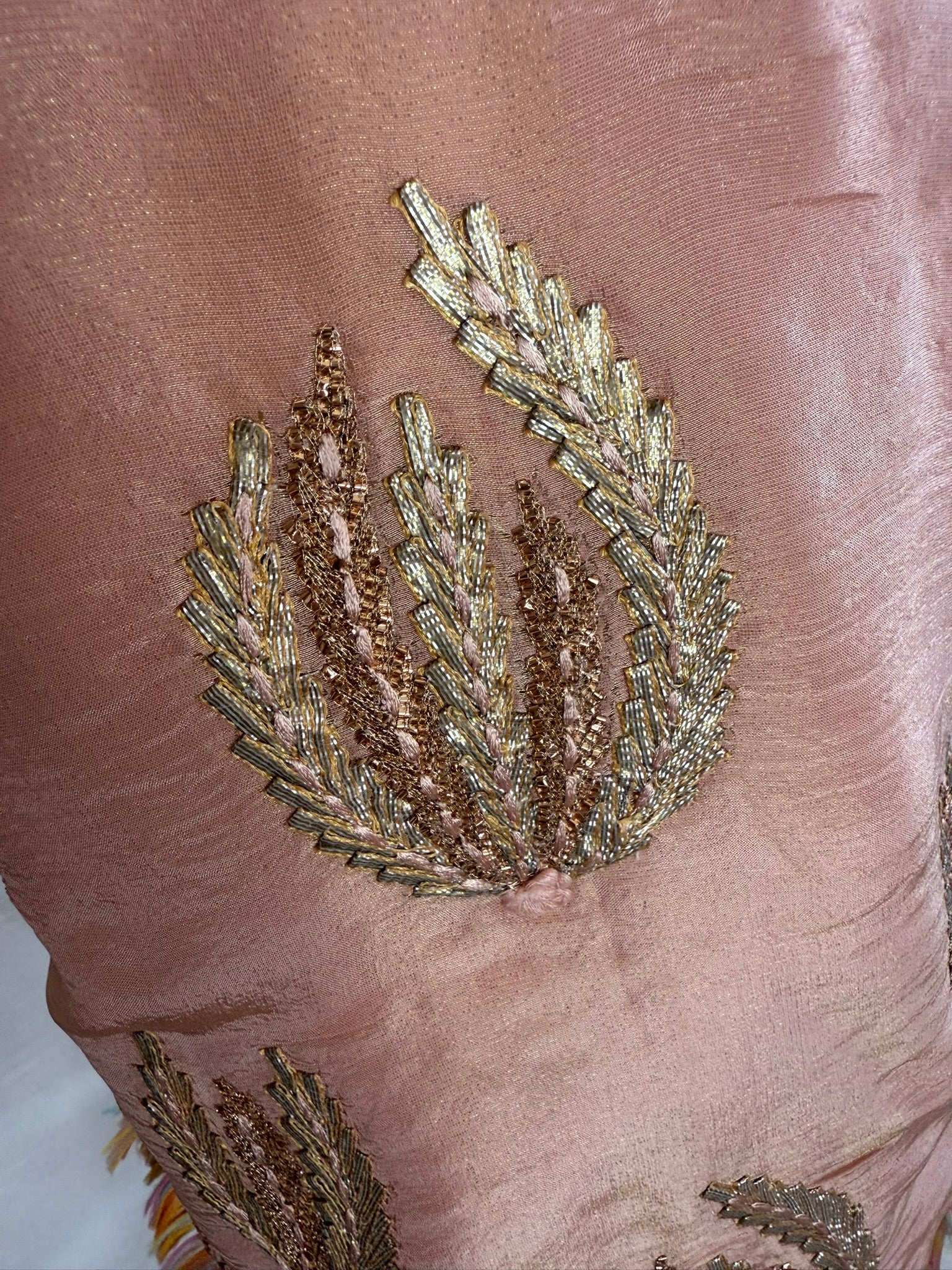 Main fabric: Banarsi silk tissue, which is a luxurious and exquisite fabric known for its sheer, lightweight texture and shimmering appearance. It is made from high-quality silk, giving it a smooth, soft and lustrous finish.