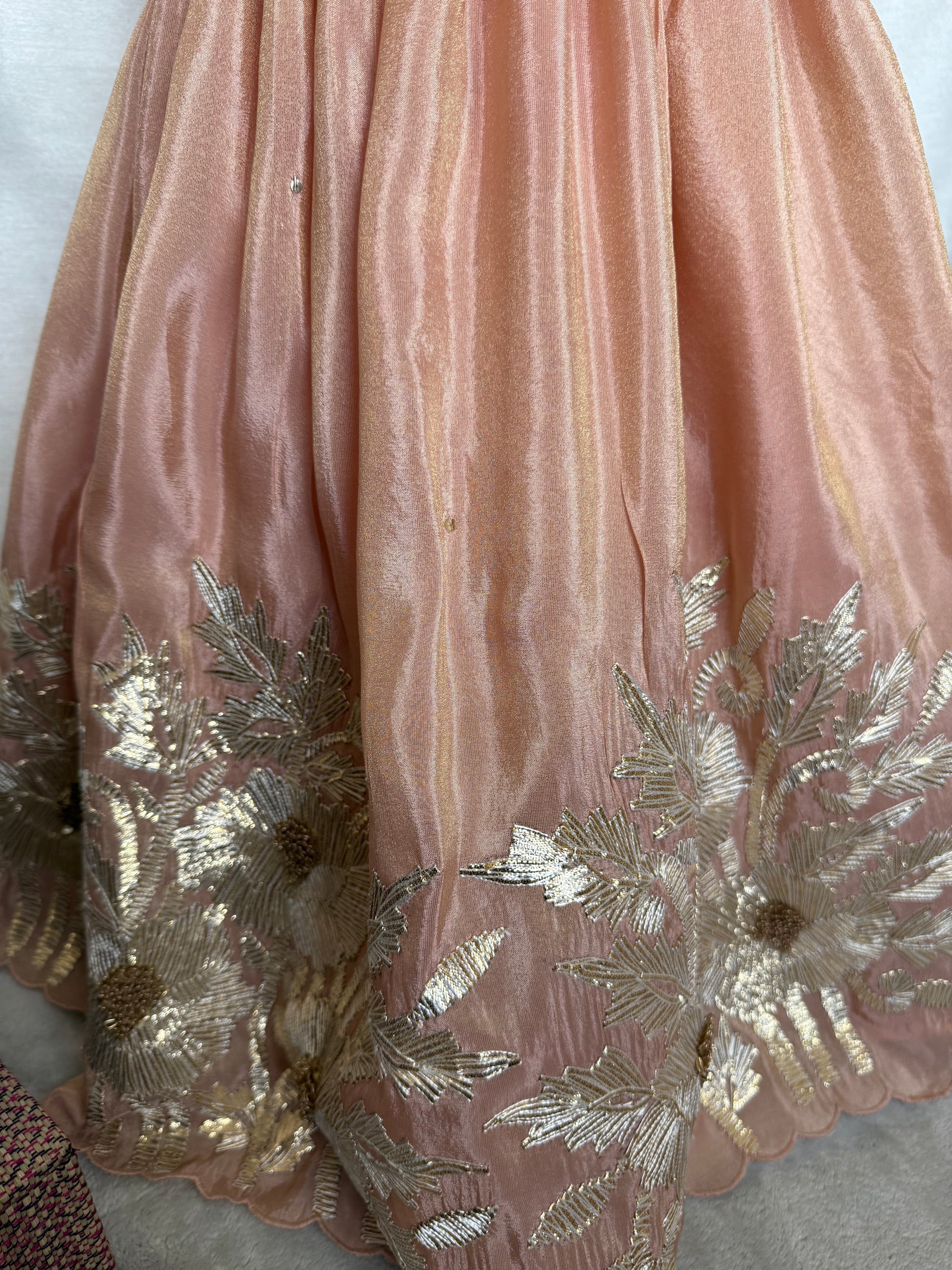 Get ready for your girl to steal the spotlight with this dusty pink lengha! The sleeveless top features stunning gota embroidery and sequins, while the frills add a playful touch. The skirt, with its elasticated waist and adjustable drawstring, ensures a comfortable and customizable fit. Complete with elegant gota flowers and fringe tassels, as well as intricate lace and sequin detailing at the hem, this lengha is the perfect blend of elegance and fun!