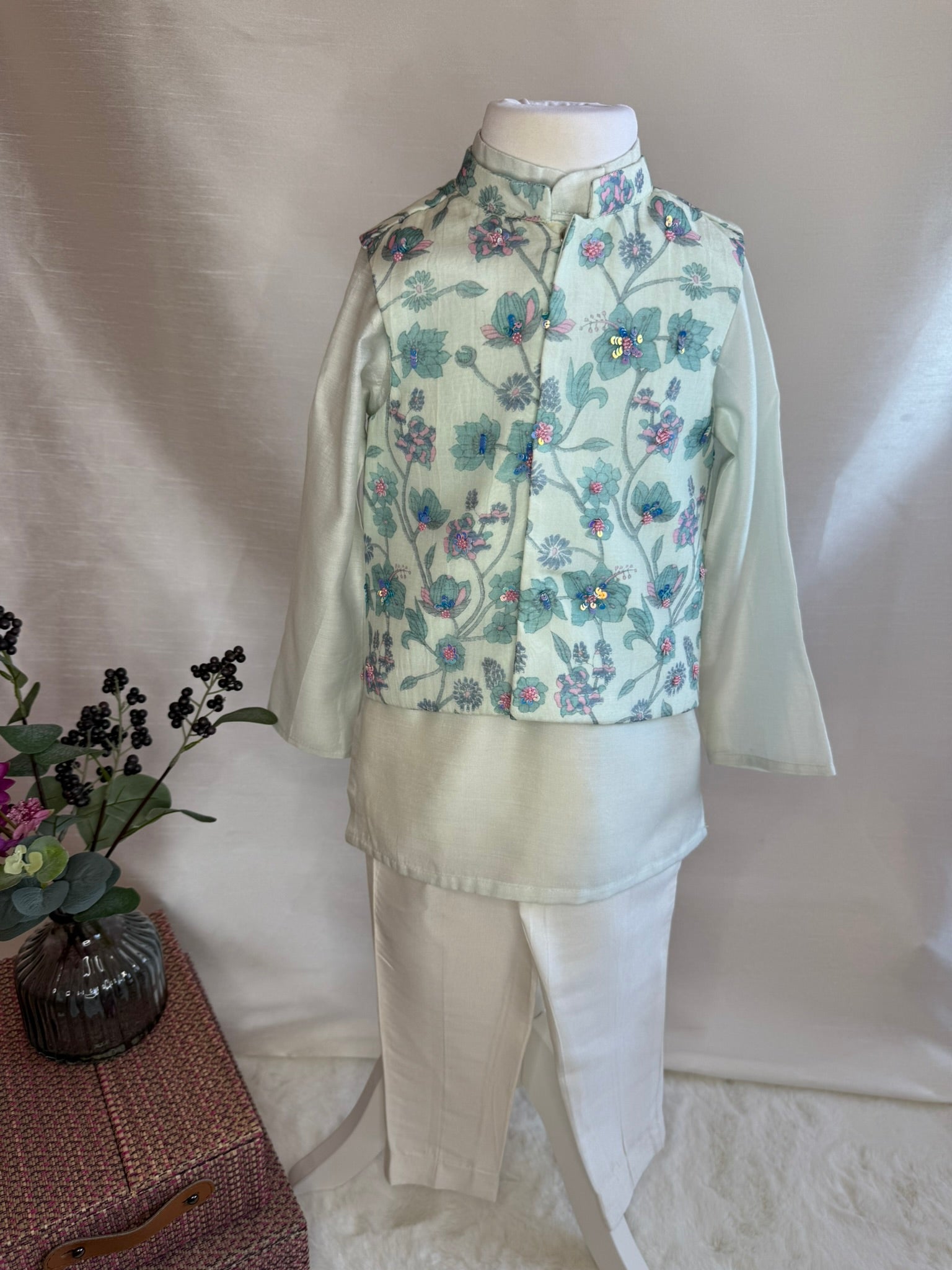 Let your child be the showstopper with this kurta set! Made of chanderi mul, the knee-length pale blue kurta comes with a sleeveless, hand-embroidered waistcoat that guarantees a head-turning look. Paired with plain white trousers, this set is perfect for weddings. Smart and gorgeous, it's sure to make your little one stand out!