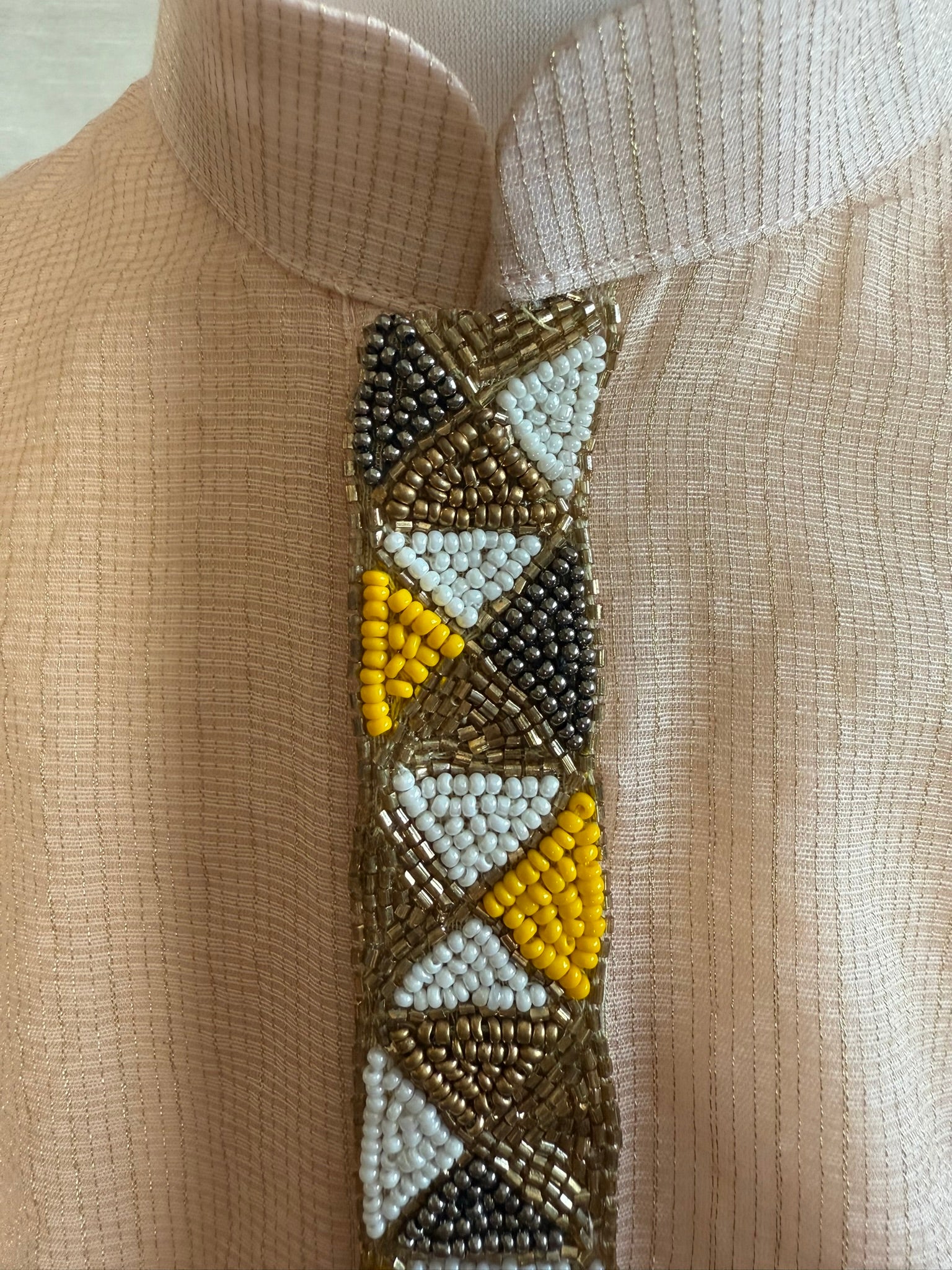 Elevate your child's style with our Pastel Pink Kurta Set, completed with ivory trousers! This soft pink kurta features delicate metallic thread woven into the fabric, adding a touch of glamour. The front is adorned with vibrant beaded embroidery, making it a perfect outfit for a pre-wedding event or festival.