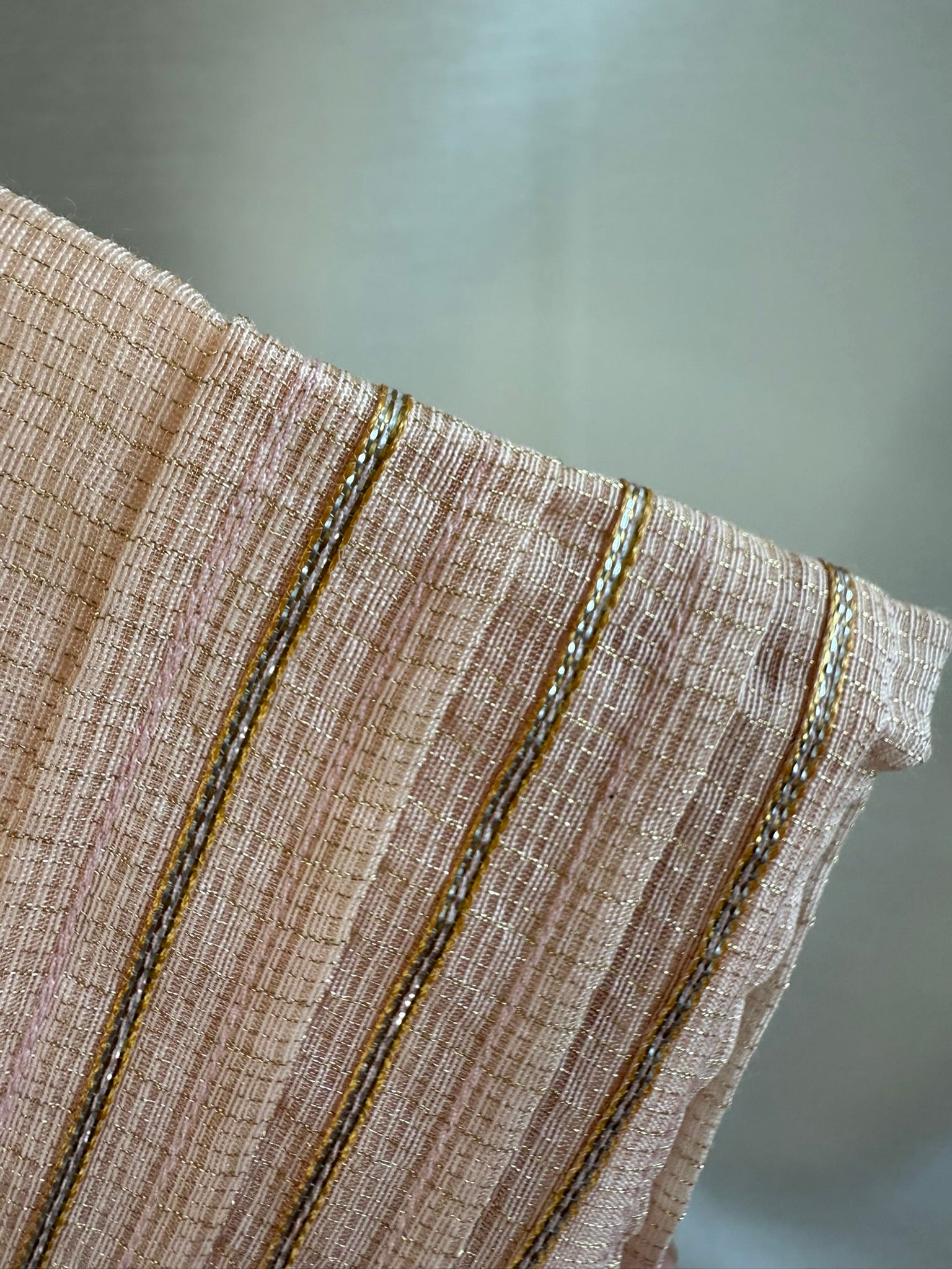 Lining: Mul mul cotton, which is a lightweight, soft and breathable fabric known for its delicate, gauzy texture. It is often loosely woven, giving it a slightly sheer and airy quality.