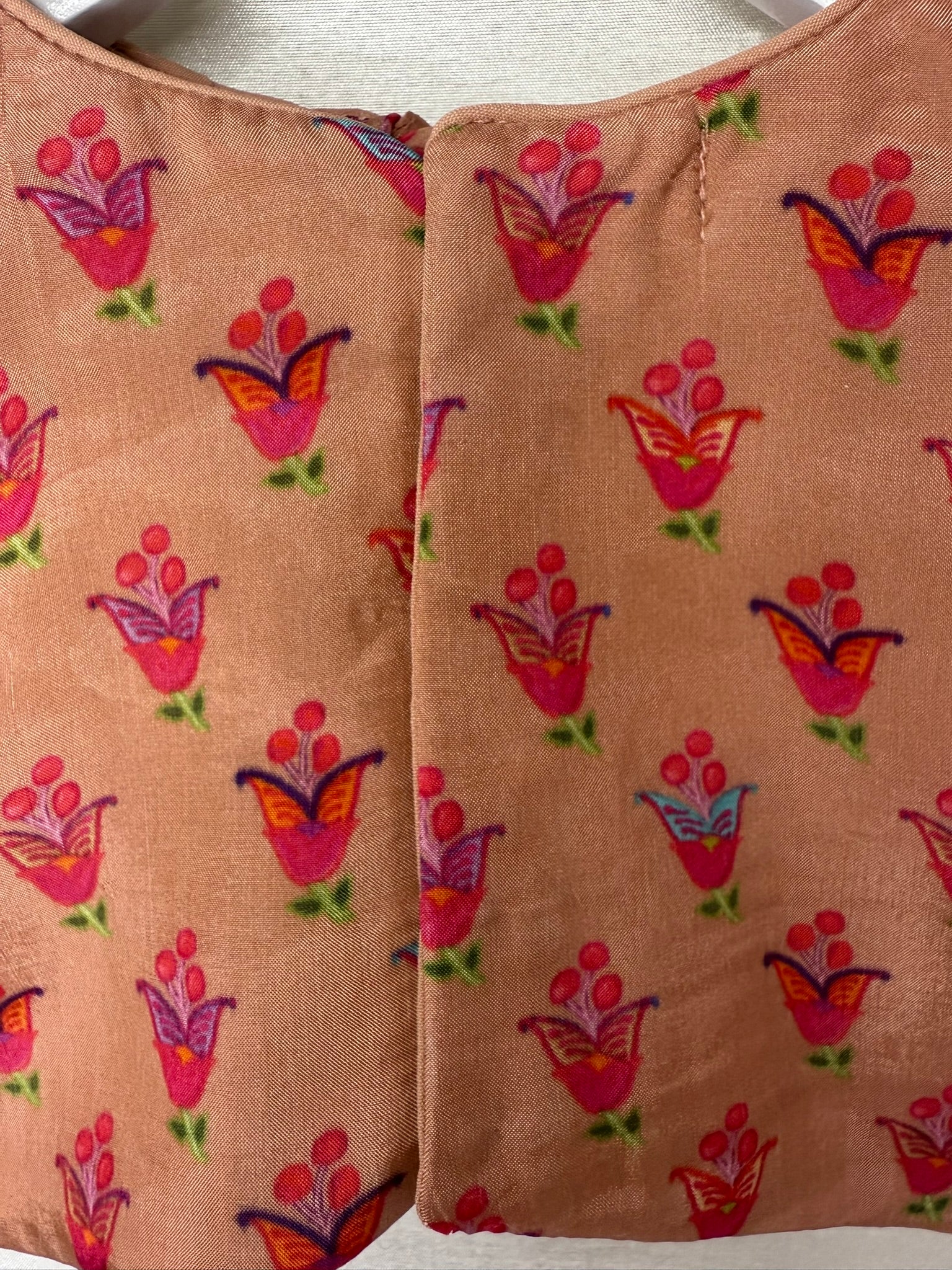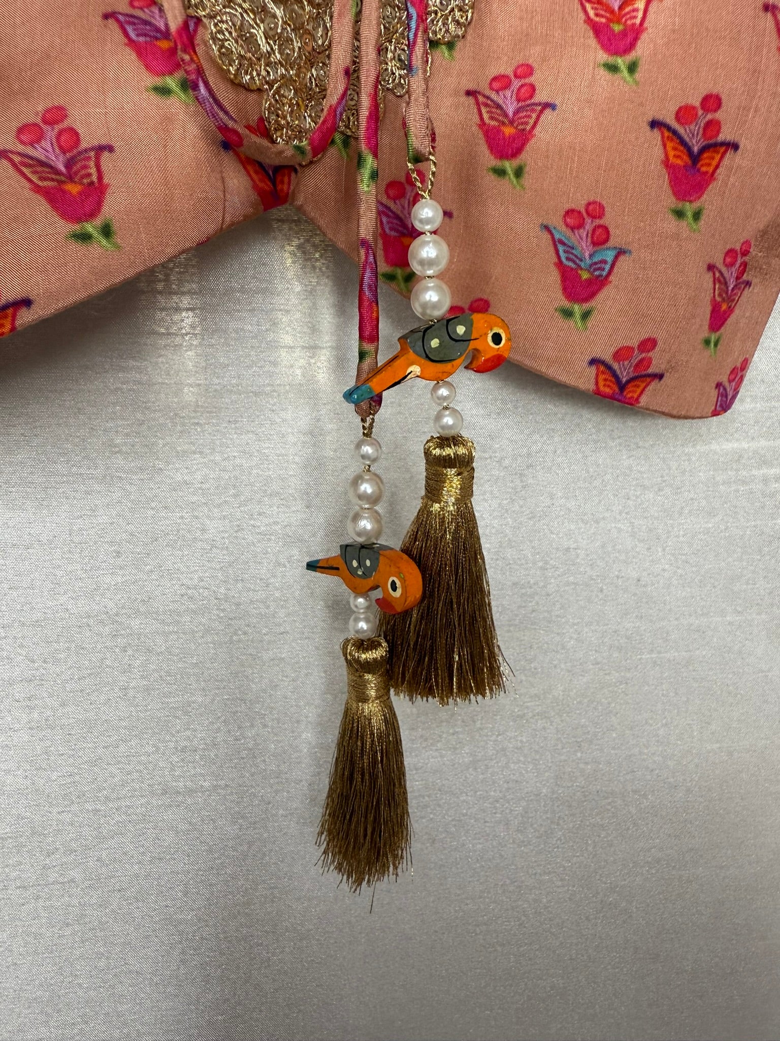 This peach lengha is all about effortless charm - flowy, lightweight and super soft for twirling with ease. The blouse features a delicate small floral print, playful tie strings adorned with adorable birds and elegant gold lace embroidery around the neckline. The lengha contrasts with a bold, larger floral print, while the sheer net dupatta completes the look. Perfect for those who love a whimsical touch with a splash of sophistication.