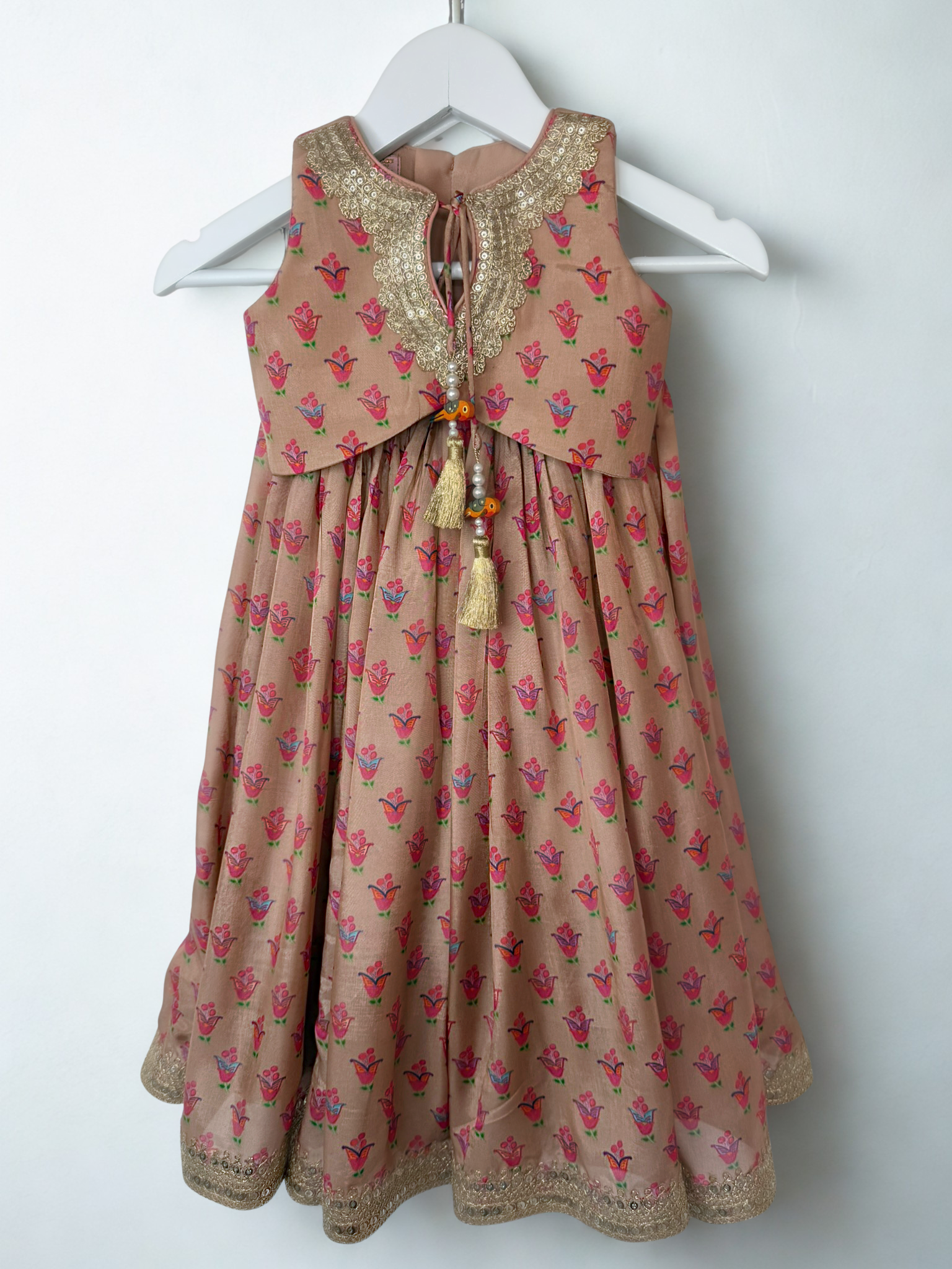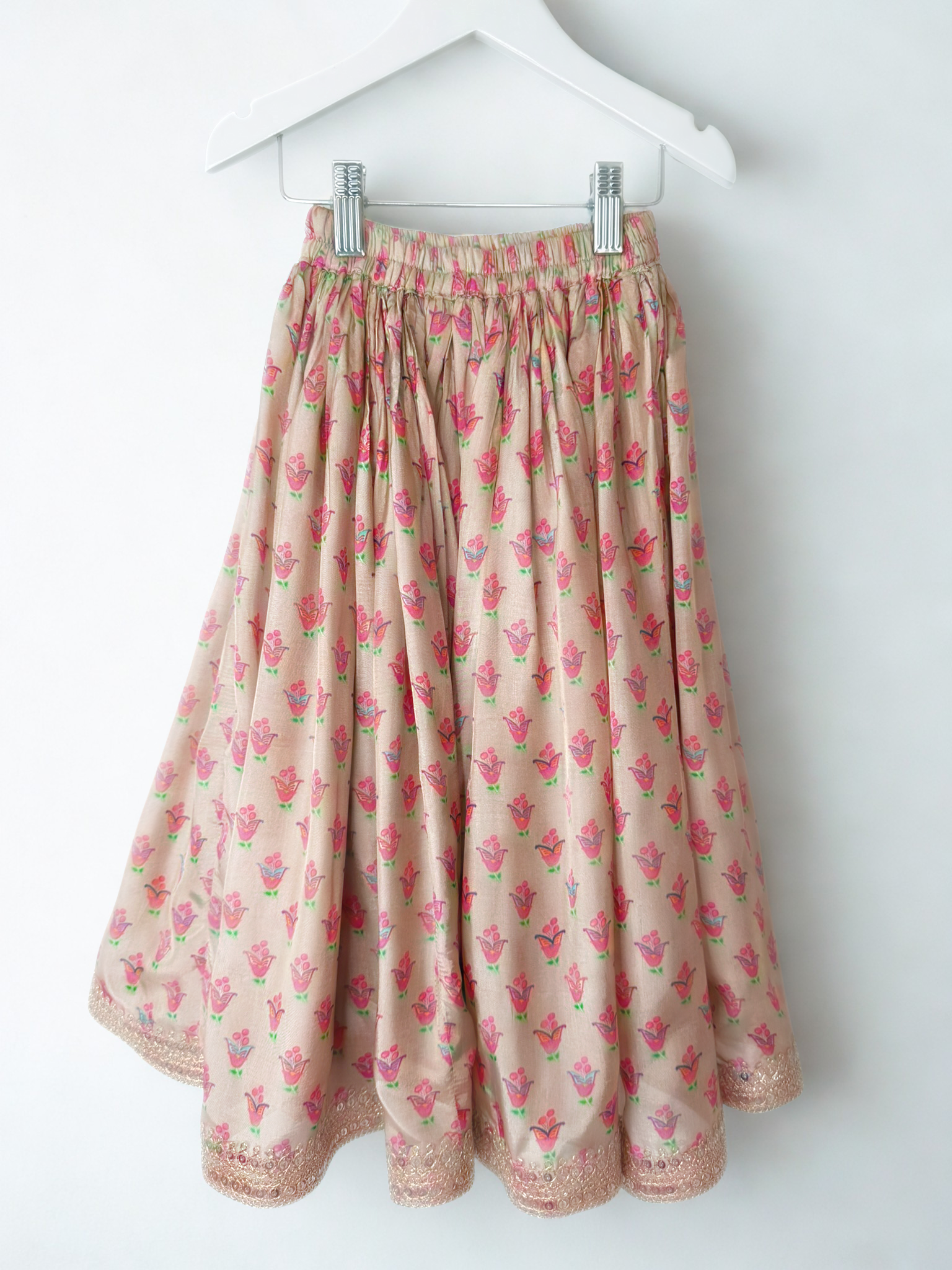Peach Floral Print Lengha with Gold Lace Embroidery