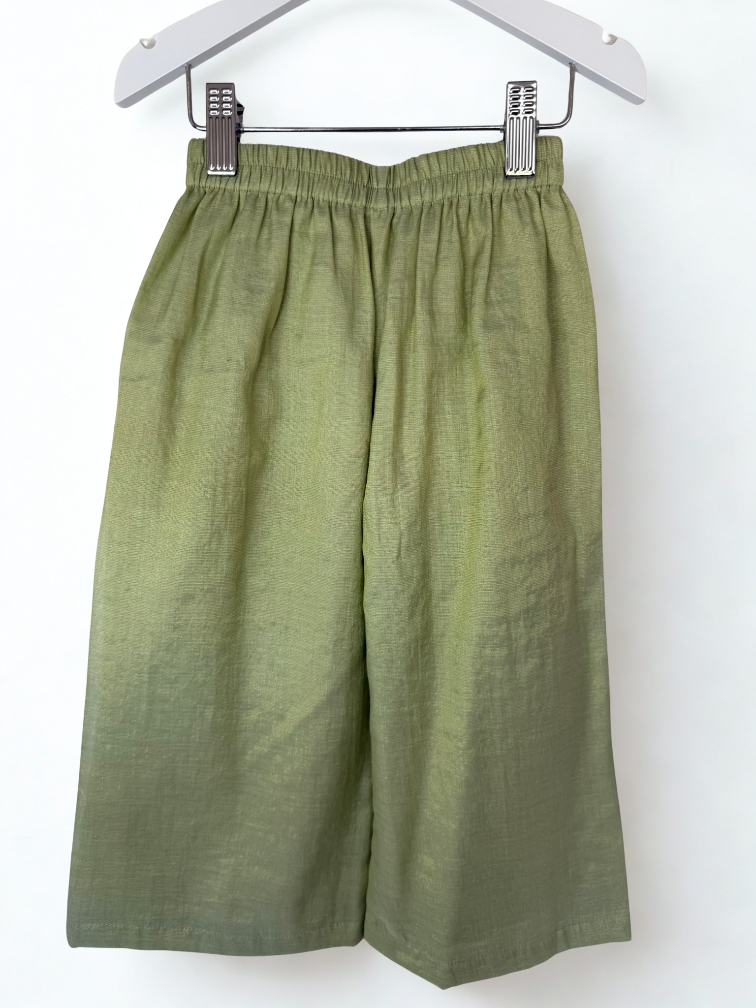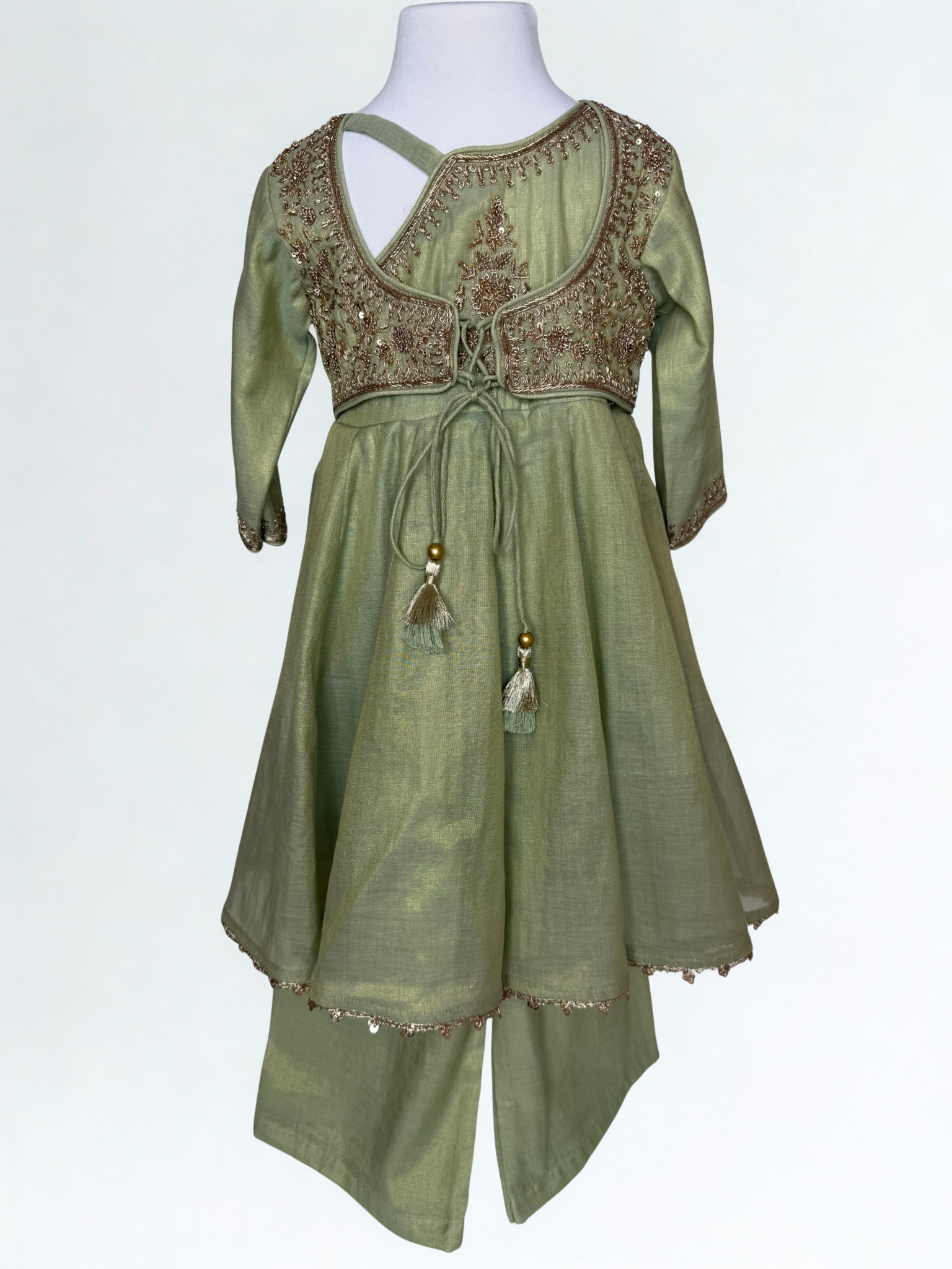 Let your child step into charm with this Pistachio Green Zari Embroidered Anarkali Set! The jacket-style top, stitched seamlessly to the flowing anarkali, features cute tassel tie strings at the front for a perfect fit every time. Intricate zari embroidery accents the cuffs and hemline, adding spark to every twirl. Paired with comfortable wide-leg trousers, this set blends elegance with a touch of fun, ready to brighten up any occasion.
